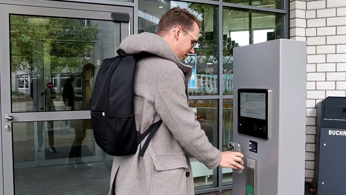 Einfach Ihren Bibliotheksausweis an der Säule vor dem Eingang scannen und schon können Sie die Bibliothek nutzen. Bitte beachten Sie, dass während Ihres Besuchs eine Videoüberwachung stattfindet.