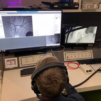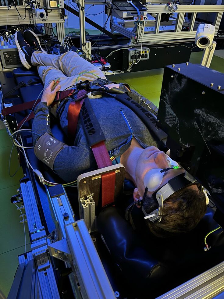 Dr. Lukas Streese ist Teil einer Forschungsgruppe am Universitätsklinikum Düsseldorf, die das Ziel verfolgt die Auswirkungen von Gravitationsveränderungen auf die Mikrozirkulation zu untersuchen. Bei längeren Weltraumaufenthalten besteht das Problem, dass Astronautinnen und Astronauten Seheinschränkungen entwickeln. Die Ursache für das sogenannte „spaceflight-associated neuro-ocular syndrome” (SANS) ist bisher nicht bekannt. Unter der Leitung von Prof. Christian Jung von der Kardiologie des Universitätsklinikums in Düsseldorf wird im Rahmen des „Retinal circulation during gravitation changes in a human centrifuge“ (RIDGE) Projektes versucht den Ursachen der mikrovaskulären Veränderungen im Auge auf den Grund zu gehen. Bei diesem Projekt sollen zusätzlich mögliche Therapieformen getestet werden, die die negativen Auswirkungen von Weltraumaufenthalten auf die Sehfähigkeit reduzieren können. Dr. Lukas Streese ist Teil des Forscherteams, dass in diesem Rahmen eine Fördersumme von 600.000 € einwerben konnte. Herr Streese wird bei diesem Projekt seine Expertise aus der retinalen Gefäßdiagnostik einbringen. Die ersten Probemessungen hat Herr Streese mit dem Forscherteam bereits durchgeführt (siehe Bilder). Ziel ist es, die retinale Mikrozirkulation bei unterschiedlichen g-Kräften während des Drehens der Zentrifuge zu messen. Dabei sollen unterschiedliche Körperlagen miteinander verglichen werden. Das RIDGE Projekt ist ein tolles Beispiel wie das Projekt Tandem Niederrhein interdisziplinäre Zusammenarbeit ermöglicht.