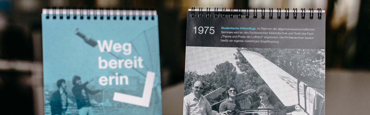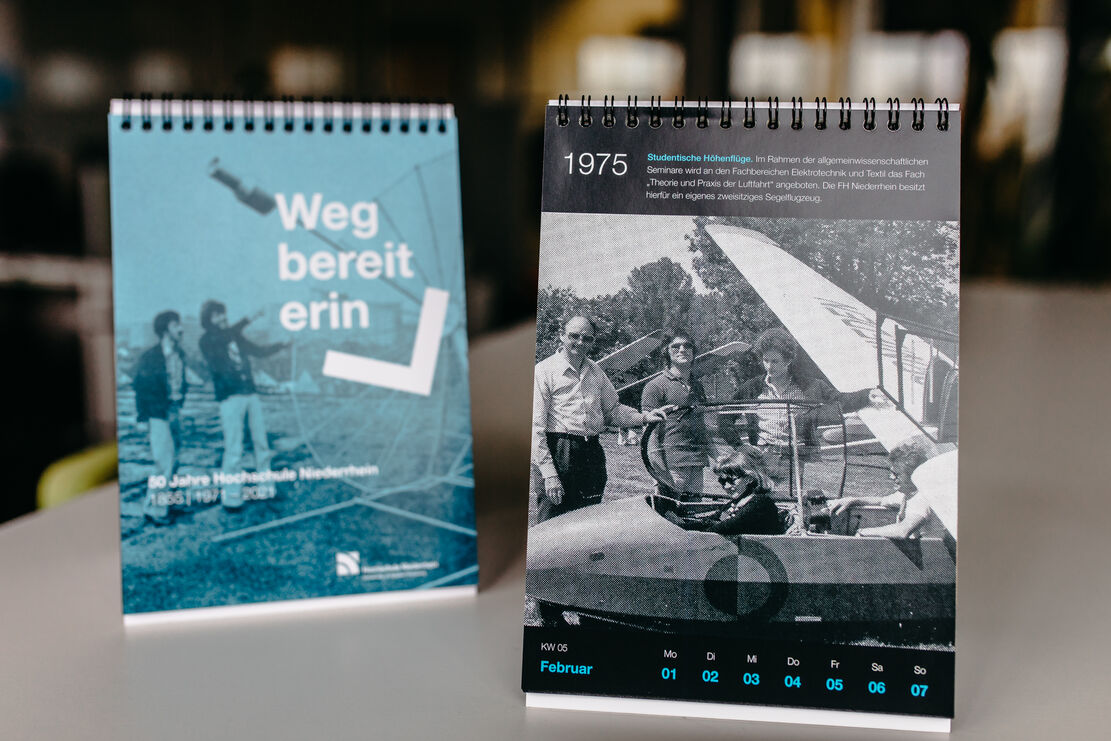 Diesen Tischkalender haben zu Beginn des Jahres alle Mitarbeitenden der HSNR erhalten. Jede Woche gibt es ein neues Motiv mit einer Kurzinfo. So können alle Beschäftigten der Hochschule das Jubiläumsjahr gemeinsam erleben, neues erfahren und Meilensteine in der Geschichte der HSNR entdecken.