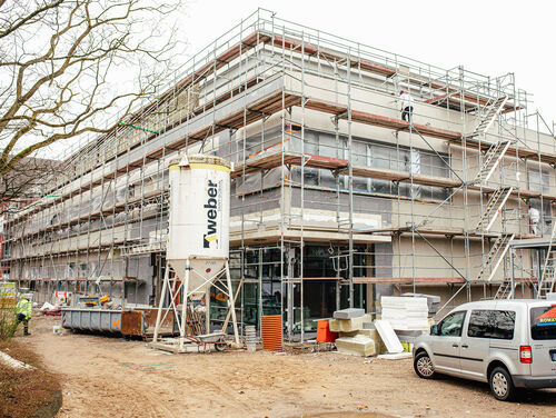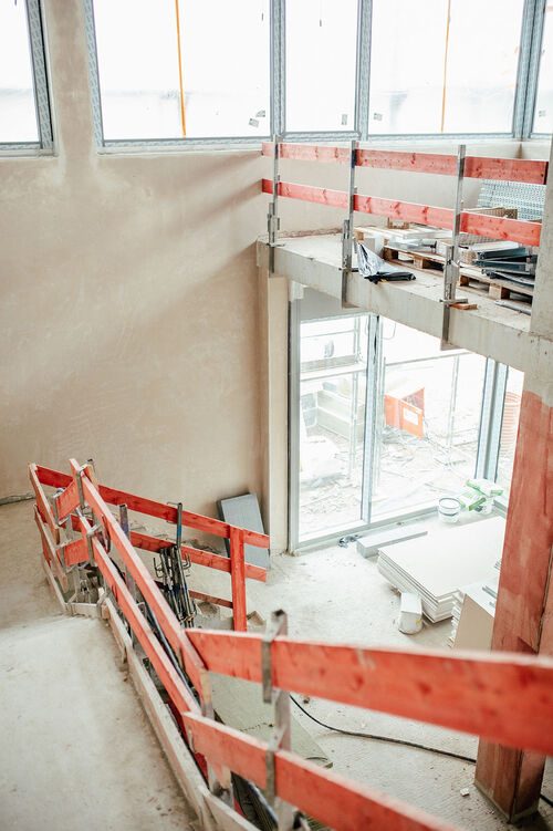 Die Fenster wurden bereits eingebaut. Derzeit erfolgt der technische Ausbau. Der Trockenbau ist in vollem Gange. In dieser Woche wird zudem damit begonnen, den roten Klinker an der Außenfassade zu montieren.