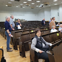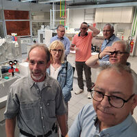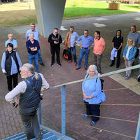Treffpunkt zum Start war das neue Chemie-Technikum Gebäude oder „da, wo früher der Parkplatz war“. In Empfang genommen wurden sie dabei von Alumni-Koordinatorin Karla Kaminski und Professor Dr. Jürgen Schram, der dann auch der Gruppe durch das Technikums-Gebäude führte. Auch wenn das sehr interessant war und aktuelle Forschungen z. B. im Bereich Mikroplastik auf großes Interesse stieß, war der zweite Teil des Rundgangs doch das, was die Augen der Alumni aufleuchten ließ. Auf der anderen Straßenseite in den alten Gebäuden fanden sich die Ehemaligen dann wieder zurückversetzt in die Zeit des Studiums. Die Räume und Labore, die Gänge, das Treppenhaus, die Gerüche und der Anblick von Laborkitteln, Arbeitsplätzen und Hörsälen riefen viele Erinnerungen wach.