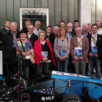 Zum Abschluss besuchte die Gruppe das Racing Team der HSNR. Diese Studierendengruppe baut jedes Jahr einen eigenen Rennwagen, welcher dann an internationalen Wettbewerben teilnimmt. Bei diesen werden nicht nur die Schnelligkeit, sondern auch technische Maßgaben und ein Businessplan beurteilt. Die Besuchergruppe zeigte ein großes Interesse sowohl am aktuellen Modell des Rennwagens als auch für die Vorgängermodelle und war beeindruckt von der Leistung der Studierenden. Wie groß das Interesse war zeigte sich in den vielen Fragen, die von den Studierenden geduldig beantwortet wurden. Nach einer Führung durch die Werkstatt des Racing Teams wurden die Alumni der Technischen Verbindung TV Borussia Magdeburg zu Krefeld mit dem Jubiläums-Buch, das anlässlich des 50jährigen Bestehens der Hochschule im letzten Jahr veröffentlicht wurde, und einem Gruppenfoto samt Rennwagen verabschiedet.