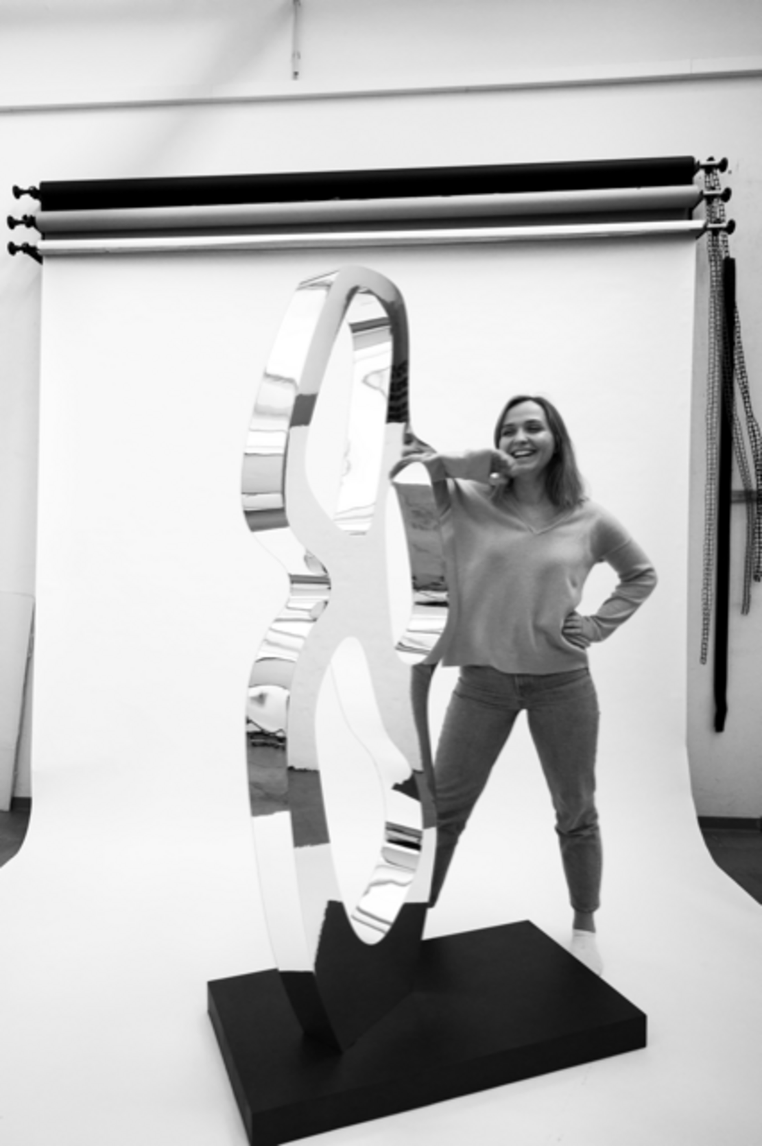 Freistehend und skulptural zeigt sich die Lösung von Carlotta Thomeczek zum Thema Garderobe und priorisiert damit die Ästhetische Funktion eines solchen Produktes. Hier zu sehen: die Designerin mit ihrem Modell im Maßstab 1:1.