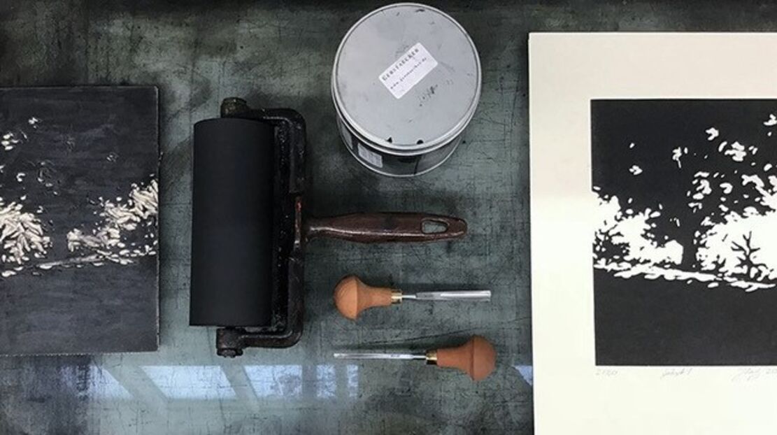 Die Idee zu den Drucken entstand auf Spaziergängen in der freien Natur zu Pandemiebeginn. Der Blick in die Baumkronen und ins Dickicht, die vielen kleinen Details, die man gar nicht einzeln, sondern nur in der Masse wahrnimmt, inspirierten Jana Zaitz zur Linoldruckserie „Geäst“. Unmittelbar nach dem Spaziergängen und ohne Skizzen vorab, nur mit Unterstützung schnell geschossener Photos wurde direkt in die Druckplatten geschnitten.