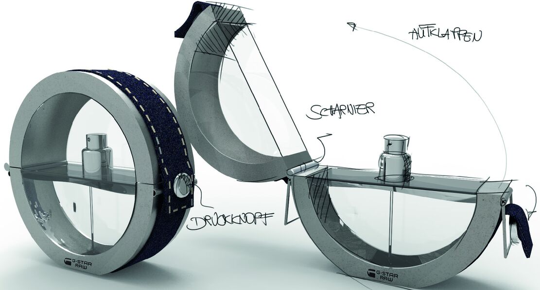 Schnelle Skizzen helfen erste Ideen und Funktionsprinzipien zu visualisieren und sind Grundlage für spätere digitale Darstellungen, die zeigen wie Denim mit Glas kontrastiert.