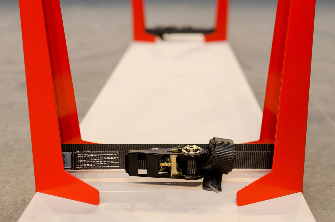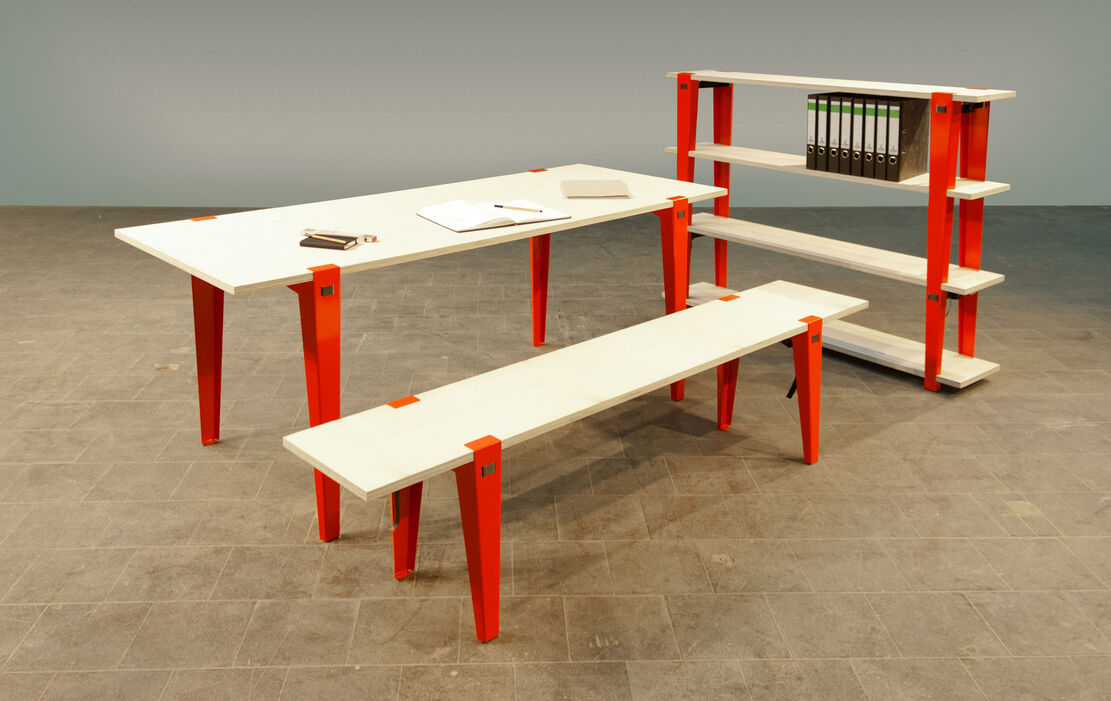 Strap-Up Philipp ist ein Möbel für dynamische Zeiten. Das System passt sich individuellen Bedürfnissen an und kann mit dem Startup wachsen. Der Aufbau erfolgt in wenigen Minuten und erfordert kein Werkzeug oder Schrauben. Die Beine aus pulverbeschichtetem Stahlblech werden einfach an eine Multiplex-Platte gesteckt und mit Spanngurten fixiert - Fertig.