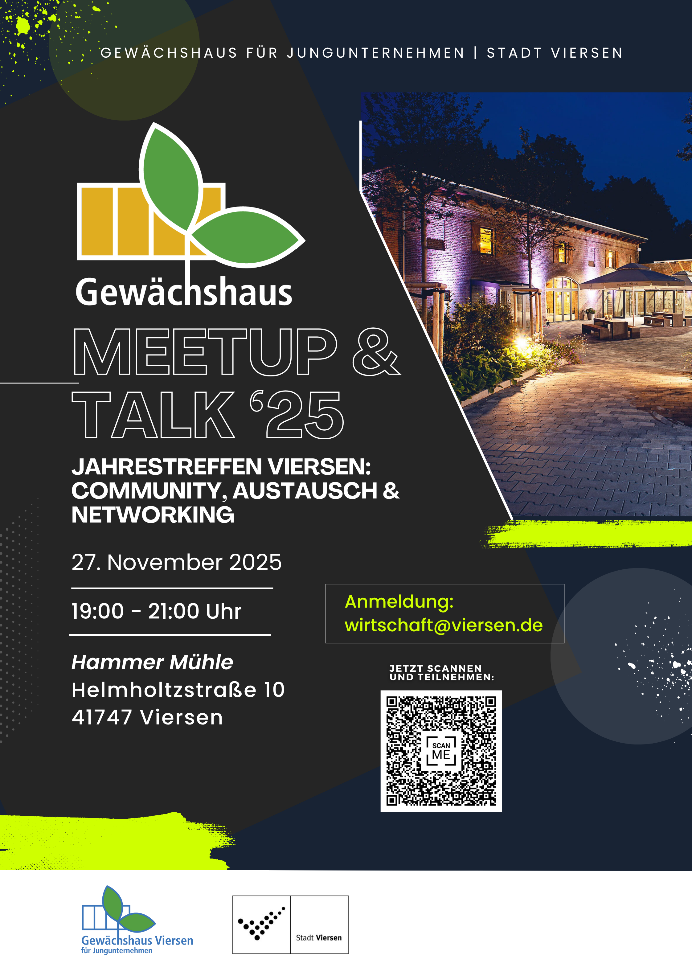 Das Gewächshaus für Jungunternehmen und die Wirtschaftsförderung der Stadt Viersen lädt Sie und dich herzlich ein, dabei zu sein! Die Veranstaltung ist Treffpunkt einer einzigartigen Mischung aus Wirtschaft, Wissenschaft und Gründung. Das Ziel? Eine fruchtbare Basis für neue Synergien zu schaffen, die Player der Region zu vernetzen und bestehende Kontakte zu pflegen. Ob (angehende) Schülerfirma, Gründende, Unternehmensverantwortliche, Vertretende der Hochschule, Beiratsmitglied oder Vorstand des Gewächshauses – hier kommen die passenden Personen für ein Match zusammen. Genießen Sie einen besonderen Abend in der stilvollen Atmosphäre der Hammer Mühle. Für das leibliche Wohl ist mit einem abwechslungsreichen Buffet und erfrischenden Getränken gesorgt. DJ simply:c begleitet den Abend mit feinen Beats und sorgt für den passenden Sound zum Netzwerken.
