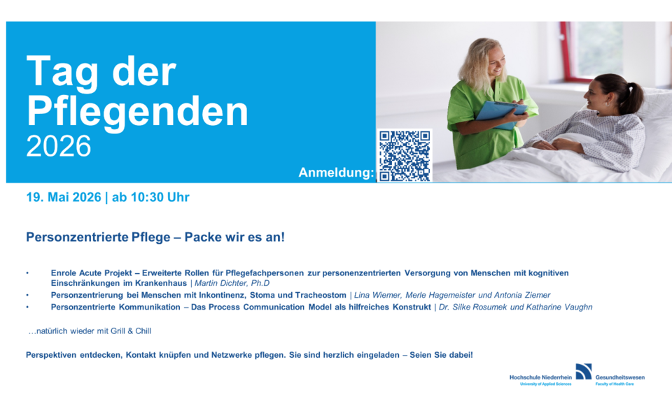 Nach wertvollen Inputvorträgen sollen interaktive Workshops stattfinden. Hier werden außerdem ausgewählte Bachelor- und Projektarbeiten aus dem Studiengang Pflege vorgestellt. Nach einer Abschlussrunde gibt es Raum und Zeit für weiteren Austausch beim "Grill & Chill" auf dem Campus Krefeld Süd.