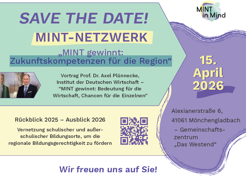 Wir möchten schulische und außerschulische Initiativen zusammenführen und gemeinsam Impulse für eine zukunftsorientierte MINT-Bildung in unserer Region setzen. Wir freuen uns sehr auf die Keynote von Herrn Prof. Dr. Axel Plünnecke (Institut der Deutschen Wirtschaft) zum Thema „MINT gewinnt: Bedeutung für die Wirtschaft, Chancen für die Einzelnen“. Im anschließenden Panel-Talk mit Vertreterinnen und Vertretern aus der Region, unter anderem mit Prof. Dr. Axel Plünnecke und Oberbürgermeister Felix Heinrichs, diskutieren wir die Bedeutung von MINT-Kompetenzen für die regionale Entwicklung sowie konkrete Handlungsansätze für Politik, Wirtschaft und Bildung.