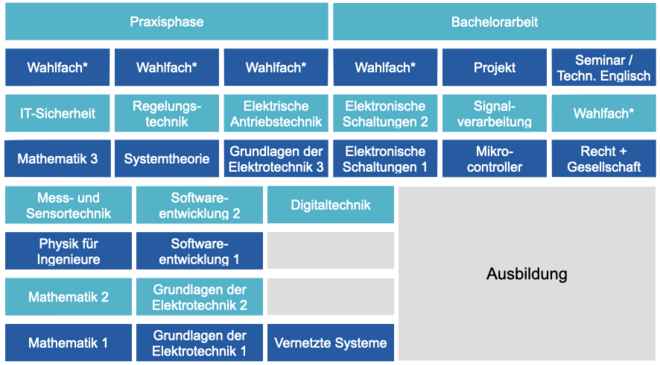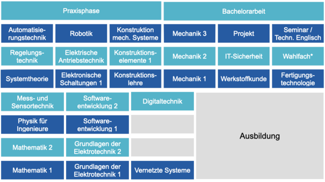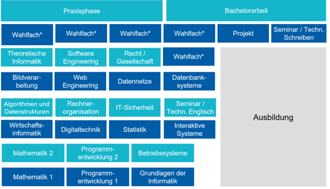 Studienverlauf: Während der Vorlesungszeit wird nach einem vorgegebenen Zeitplan zwischen Betrieb und Hochschule gewechselt. In der vorlesungsfreien Zeit finden je nach Fachsemester Blockveranstaltungen in der Hochschule statt.