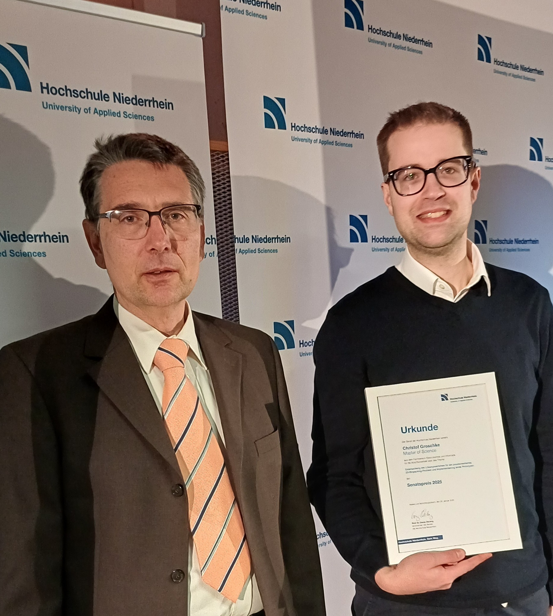 Am Montag, 26.01.2026, ist unser Master-Absolvent Christof Groschke für seine Abschlussarbeit mit einen Senatspreis der Hochschule Niederrhein ausgezeichnet worden. Das iPattern-Team gratuliert Herrn Groschke zu diesem Erfolg.
