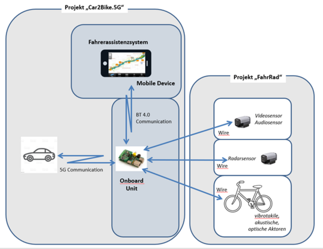 Das Fahrerassistenzsystem des Projekts „Car2Bike.5G“ berücksichtigt die Ergebnisse und Erkenntnisse des Projekts „FahrRad“. Die Informationen und Daten, die dabei durch die Fusion von Radar- und Kamerasensoren ermittelt wurden, werden auch weiterhin durch das Fahrerassistenzsystem verarbeitet und dem Radfahrer auf einem mobilen Endgerät benutzergerecht dargestellt.