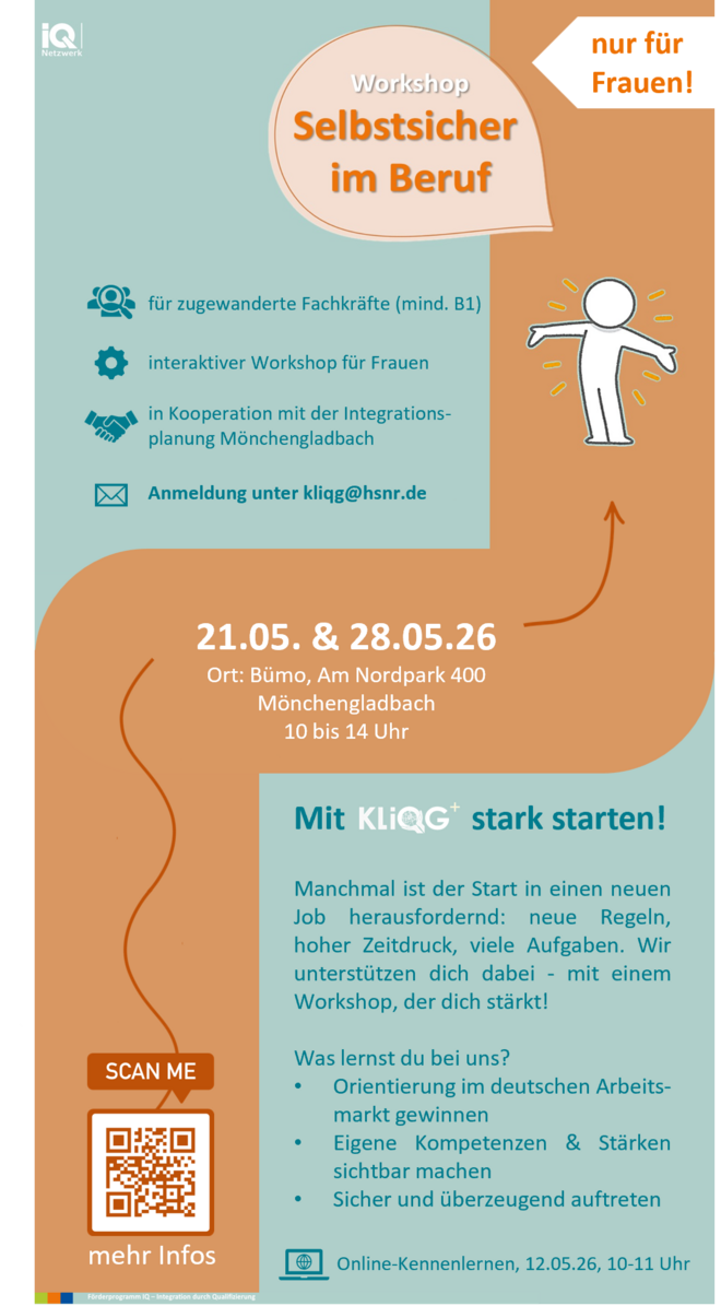 Interaktiver Workshop für zugewanderte Fachkräfte zur Stärkung von Selbstsicherheit, Resilienz und beruflicher Handlungskompetenz. Die Teilnehmenden entwickeln praxisnahe Strategien, um Herausforderungen im Arbeitsalltag souverän zu meistern, ihre eigenen Ressourcen zu nutzen und sich besser zu vernetzen.