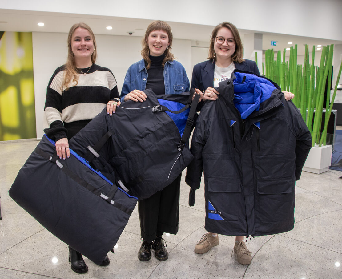 Tatsächlich waren die Gespräche mit Menschen, die auf der Straße leben, ausschlaggebend für das passende Design und die Funktionalität von „Wafe“. „Erst dadurch ist uns erst richtig klargeworden, worauf es ankommt“, sagte Studentin Klara Schuh. Auf Wunsch der Betroffenen entschieden sich die Kommilitoninnen vom Fachbereich Textil- und Bekleidungstechnik für ein unauffälliges, aber sicheres Design. In ihrem gemeinsamen Semesterprojekt gestalteten sie Jacke und Schlafsack in zurückhaltendem Schwarz, das Inneneben in Blau. Dezent vernähte Reflektoren sorgen für die nötige Sichtbarkeit bei Nacht im Straßenverkehr.