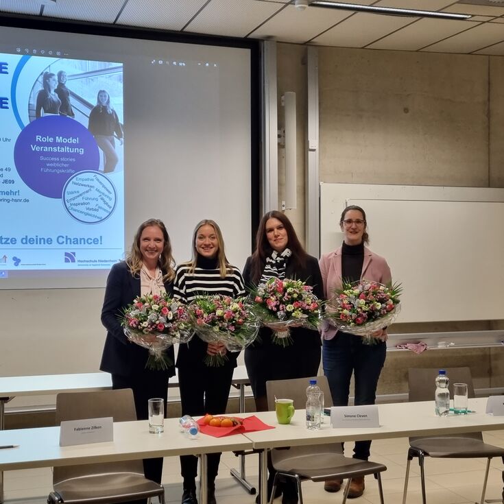 Am 12. Dezember fand am Fachbereich Wirtschaftsingenieurwesen ein weiterer Role-Model-Dialog MINT statt. Fabienne Zilken (Bauleiterin der STRABAG AG), Kerren Drews (Technical Plant Manager, Bayer AG), Simone Cleven (Senior IT Consult, GOB Software & Systeme GmbH & Co. KG) und Kirstin Lintjens (Leiterin des Gesundheitsamtes der Stadt Krefeld) berichteten Studierenden über ihre Karrierewege, Erfahrungen und den Herausforderungen, denen sie in ihrem bisherigen Berufsleben begegnet sind.