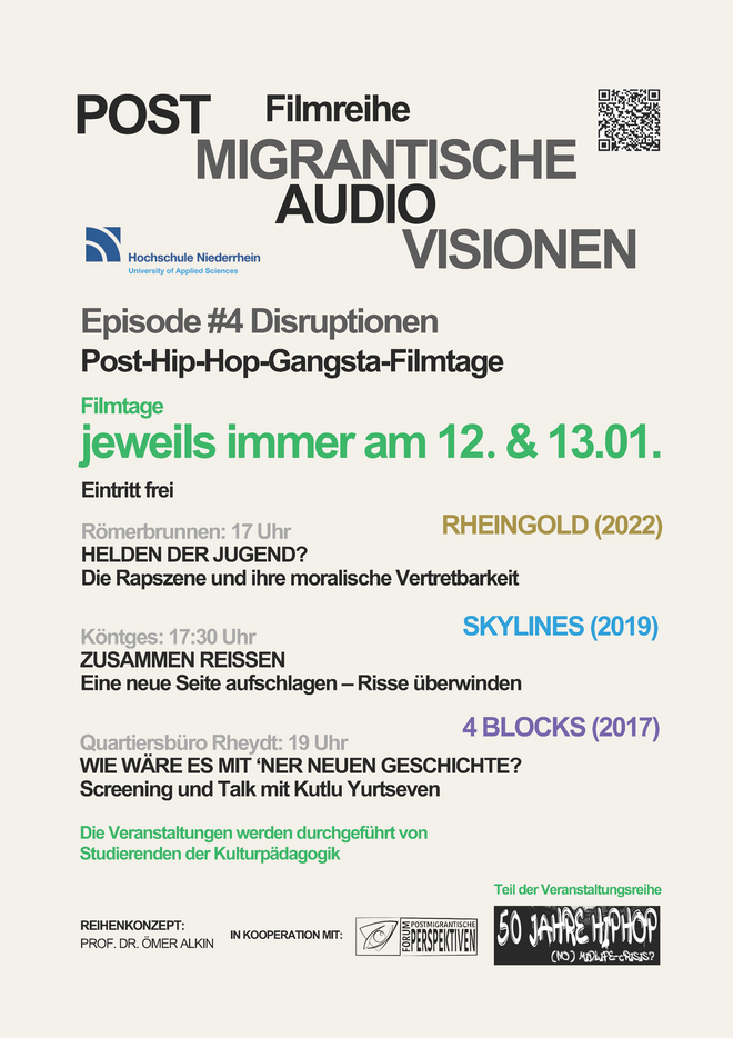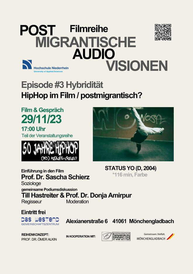Zum Nachdenken, ob und wie also Hip Hop immer schon oder auf neue Art und Weise postmigrantisch ist und war, laden die Postmigrantischen Audiovisionen den Film “Status Yo” (D, 2004), das Publikum und Expert:innen zu dem Thema ein, um im Jugendzentrum Westend darüber zu diskutieren.