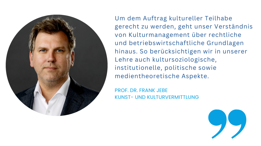 Der Masterstudiengang "Kulturpädagogik & Kulturmanagement" ist in seiner Art einmalig in der Bundesrepublik Deutschland. Unser interdisziplinärer Ansatz verknüpft auf hohem wissenschaftlichen Niveau die Arbeitsbereiche Vermittlung und Management. Mit Blick auf den gesellschaftlichen und institutionellen Wandel sind Sie nach dem Studium für die vielfältigen Management- und Vermittlungsaufgaben in der Kultur-, Medien- und Bildungslandschaft hervorragend aufgestellt.