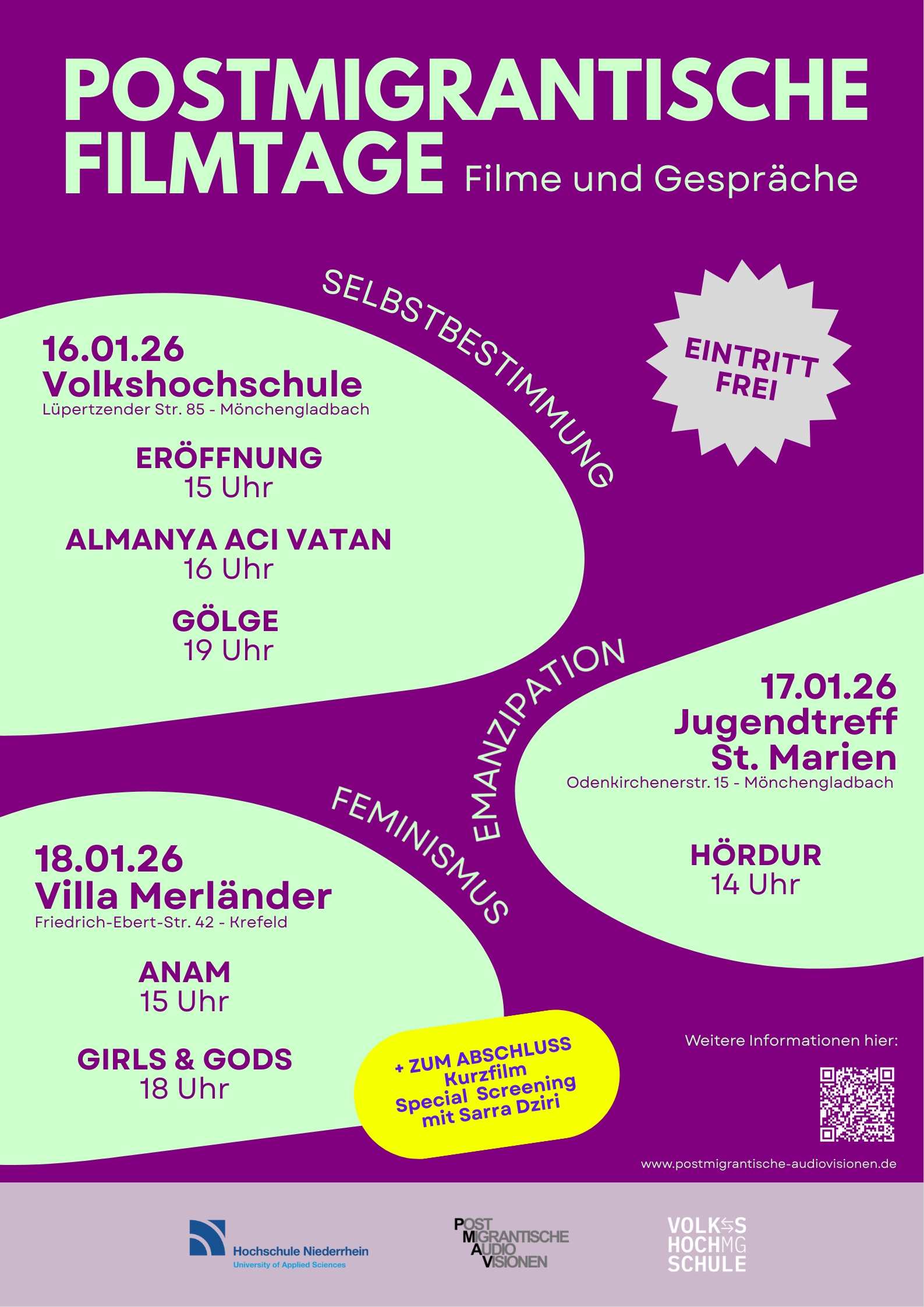 Was bedeutet es, in einer Gesellschaft zu leben, die von vielfältigen Herkünften geprägt ist? Die „Postmigrantischen Filmtage“ holen diese Fragen aus dem politischen Diskurs direkt zu uns in die Quartiere. An drei besonderen Spielstätten in Mönchengladbach und Krefeld zeigen wir sechs ausgewählte Spiel- und Dokumentarfilme und einen Kurzfilm, die den Fokus auf postmigrantische Lebensrealitäten richten.