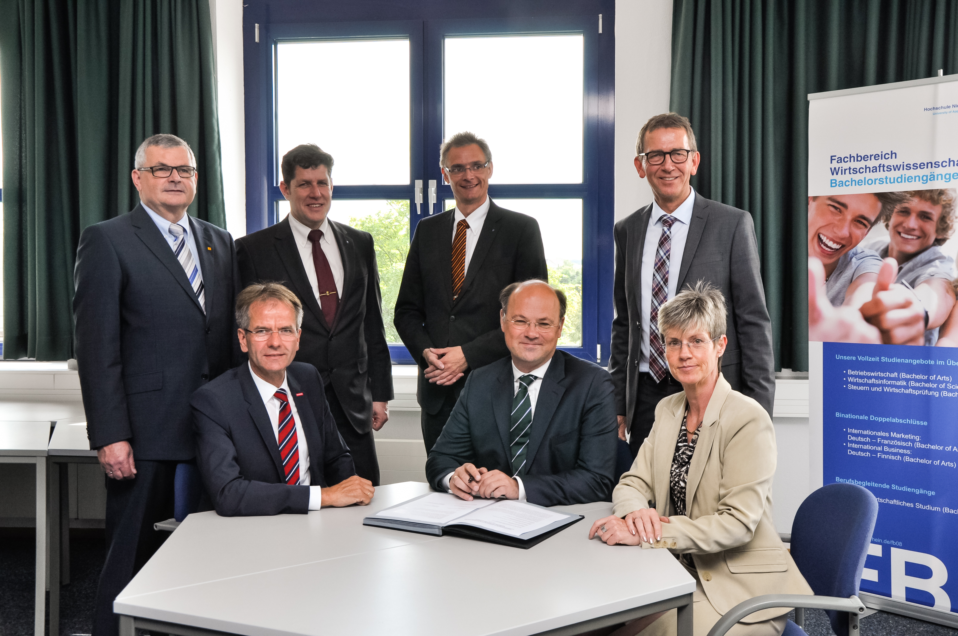 „Mit dem neuen Studienangebot schaffen wir für die Handwerksbetriebe der Region eine interessante Perspektive: Wir verbinden die Ausbildung im Handwerk bis zum Meister mit einem Bachelorstudium und ermöglichen es auf diese Weise, qualifizierte Nachwuchskräfte langfristig an das Handwerk zu binden und sie auf spätere Führungsaufgaben vorzubereiten", sagte Hochschulpräsident Prof. Dr. Hans-Hennig von Grünberg anlässlich der Unterzeichnung der Absichtserklärung heute auf dem Campus Mönchengladbach der Hochschule Niederrhein.