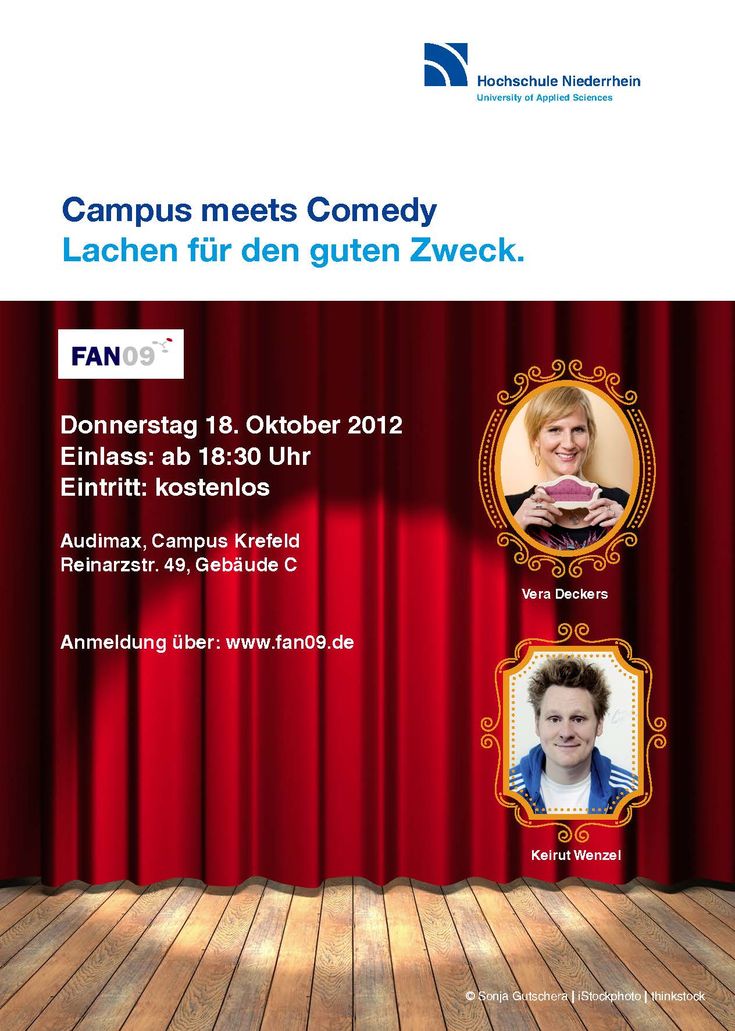 Krefeld, 10. Oktober. Lachen für den guten Zweck – unter diesem Motto steht ein Comedy-Abend, zu dem die Hochschule Niederrhein und der Förderverein FAN09 einladen. Die beiden Comedians Keirut Wenzel („Was guckst Du") und Vera Deckers (laut Express „die erfrischendste Komikerin des Rheinlands") treten am Donnerstag, 18. Oktober, im Audimax an der Reinarzstraße in Krefeld auf. Der Eintritt zu diesem Comedy-Event ist frei, um Spenden für die Kindertafel Krefeld wird gebeten.