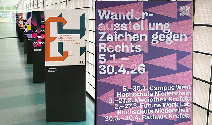 Mit der Wanderausstellung „Zeichen gegen Rechts“ präsentieren der Fachbereich Design der Hochschule Niederrhein (HSNR), der Förderverein Villa Merländer und der NS-Dokumentationsstelle der Stadt Krefeld in der Villa Merländer die Ergebnisse einer besonderen Kooperation. Ab dem 5. Januar 2026 sind die entstandenen Plakat- und Designkonzepte an verschiedenen Orten der HSNR sowie im Stadtgebiet Krefelds öffentlich und kostenfrei zugänglich.