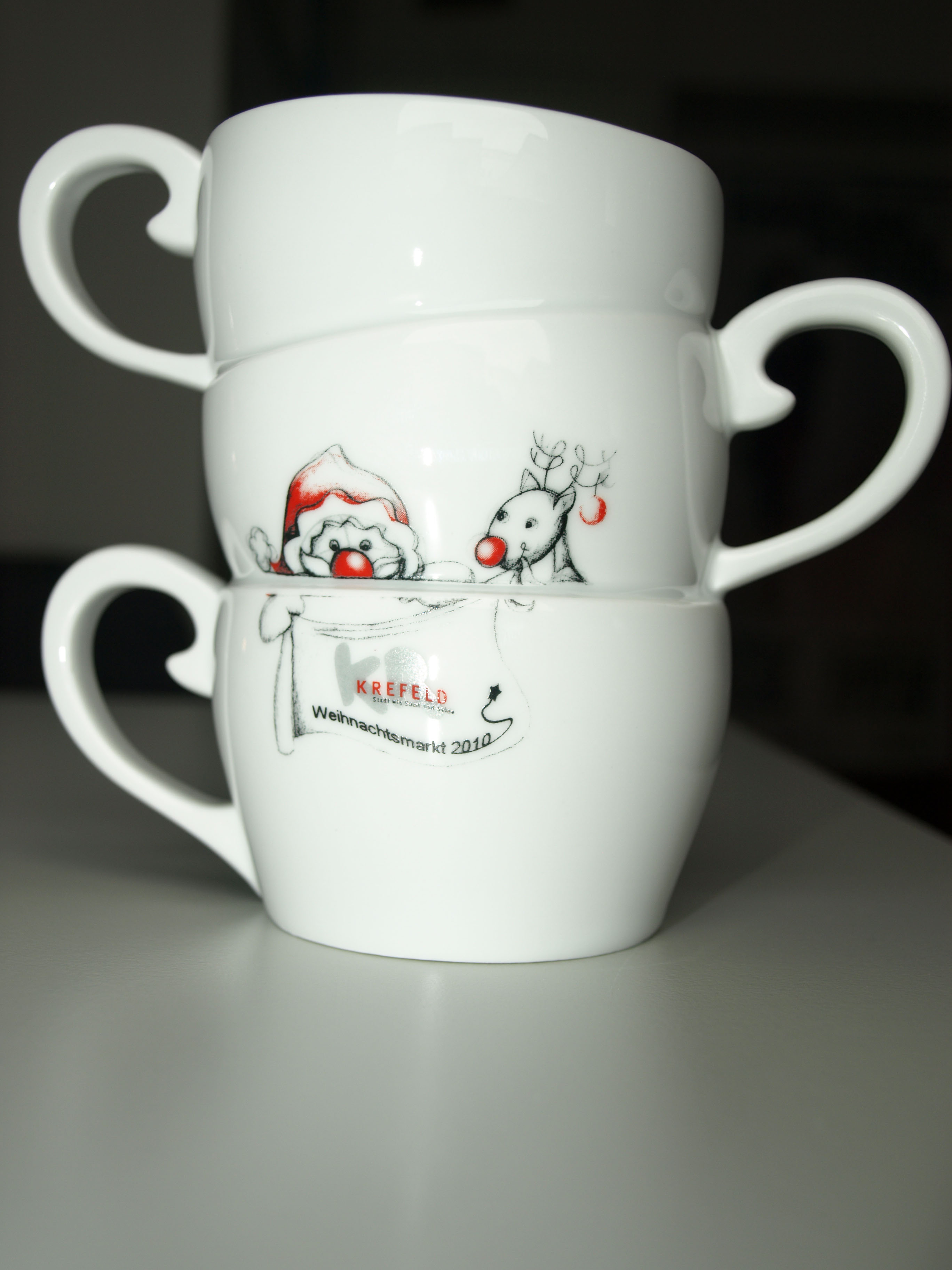 Krefeld, 26. November. Die Krefelder Weihnachtsmarkt-Tasse ist in diesem Jahr ganz besonders außergewöhnlich ausgefallen: Sie stellt eine Illusion von drei ineinander gestapelten Tassen dar, ist aber tatsächlich nur eine Tasse - mit drei Griffen. Sie kann auf dem Krefelder Weihnachtsmarkt gekauft werden - oder auf dem Weihnachtsbasar der Design-Studenten in der Shedhalle am Frankenring. Dort verkaufen Studierende des Fachbereichs Design am Freitag, 3. Dezember, 15 Uhr, nämlich all das, was sie im vergangenen Jahr so entworfen und produziert haben.