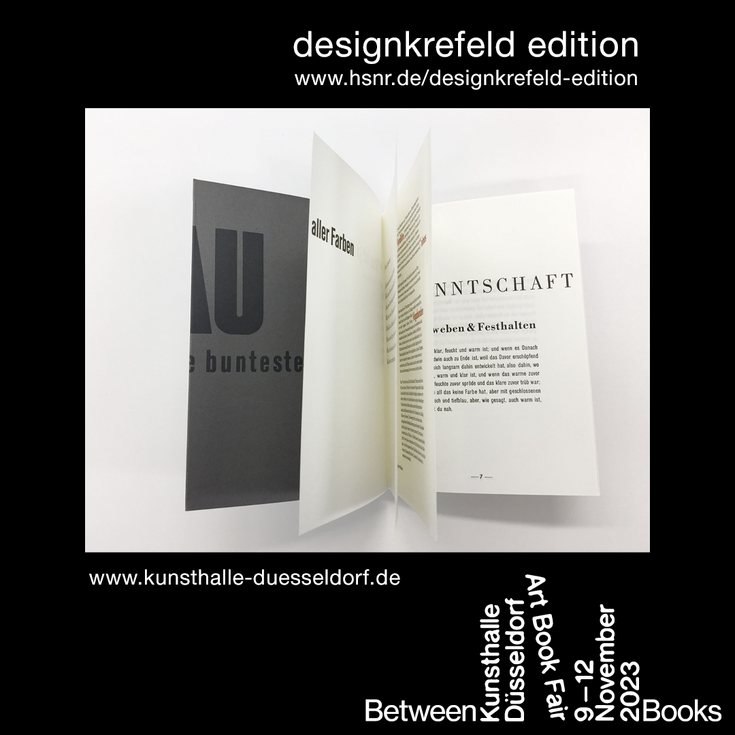 Der Fachbereich Design der Hochschule Niederrhein präsentiert seine Publikationen unter dem Namen „designkrefeld edition“ auf der Art Book Fair „Between Books“ in der Kunsthalle Düsseldorf am Grabbeplatz 4. Vom 9. bis 12. November 2023 haben Besucherinnen und Besucher die Möglichkeit, die unterschiedlichsten zeitgenössischen Formen des Medium Buch zu entdecken.