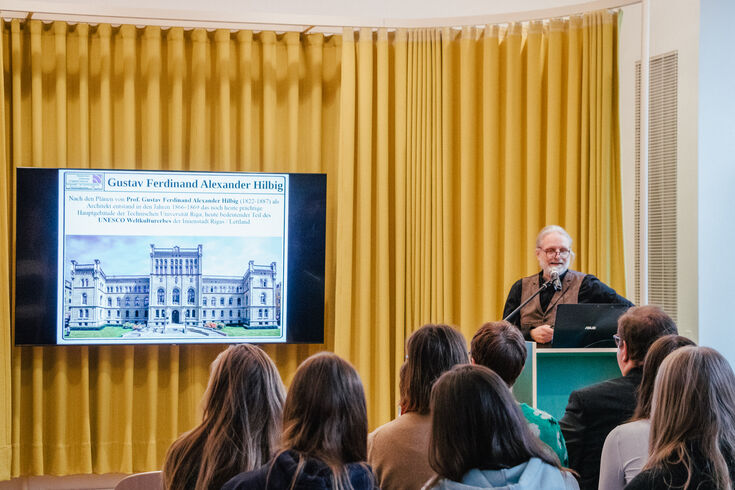 Zum Auftakt hielt Dr. Jürgen Schram, Professor am Fachbereich Chemie der HSNR, einen Vortrag über Krefelds Entwicklung um 1900 im Kontext der Handwerker- und Kunstgewerbeschule Krefeld. Schram erzählte den Schüler:innen in einer reichlich bebilderten Präsentation über die Vorgängerinstitution der Hochschule.