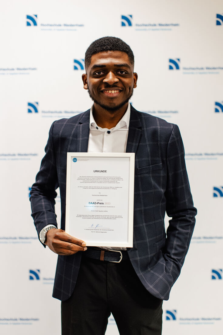 Für seine herausragenden Studienleistungen und sein soziales Engagement wurde Herr Emrick Chatlin Nguekeu De Mofo mit dem DAAD-Preis 2023 ausgezeichnet. Der Preis wird an der Hochschule Niederrhein jährlich an internationale Studierende verliehen, um hervorragende Leistungen und außergewöhnliches Engagement zu würdigen. Die mit 1.000 Euro dotierte Auszeichnung wurde dem 25-Jährigen im Rahmen der Senatspreisverleihung an der Hochschule überreicht.