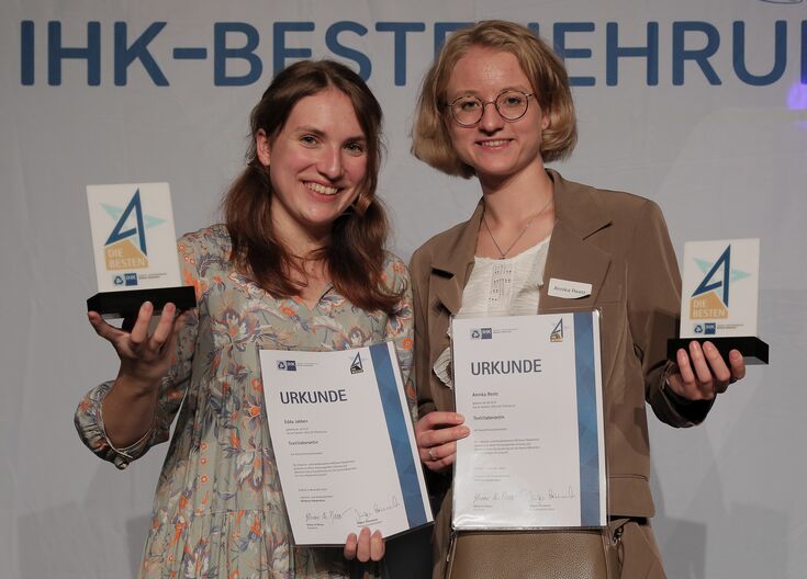 Im Sommer 2022 haben die beiden Frauen ihre Abschlussprüfung bei der Industrie- und Handelskammer Mittlerer Niederrhein abgelegt – mit beachtlichem Erfolg: Beide Auszubildende gehören zu den besten IHK-Auszubildenden in ganz Nordrhein-Westfalen. Jabben erzielte ein Endergebnis von 99,5 Punkten, Reetz schnitt mit 99,4 Punkten ebenfalls hervorragend ab. Da die Endergebnisse aufgerundet werden, haben beide mit der Maximalpunktzahl von 100 Punkten bestanden.