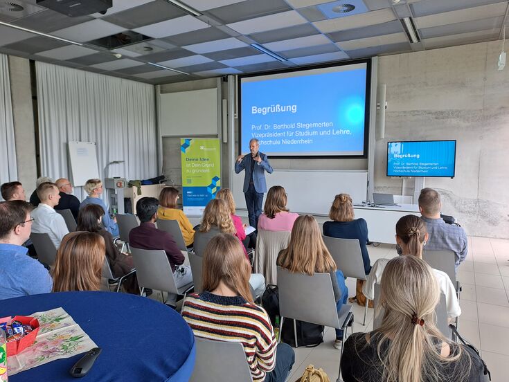 Die Abschlussfeier des HONOUR-Stipendiums eröffnete Professor Dr. Berthold Stegemerten, Vizepräsident für Studium und Lehre, mit herzlichen Begrüßungsworten. In seiner Eröffnungsrede betonte er, wie wichtig interdisziplinäre Projekte und der Blick „über den Tellerrand“ gerade für leistungsstarke Studierende sind. Es folgte ein Vortrag von Dr. Salima Douven, Vizepräsidentin Open Innovation & Incubation bei Henkel dx, die die Studierenden motivierte, selbstwirksam zu handeln und auch kleine Umwege oder vermeintliche Hürden im beruflichen Werdegang als sinnvolle Herausforderung zu sehen.
