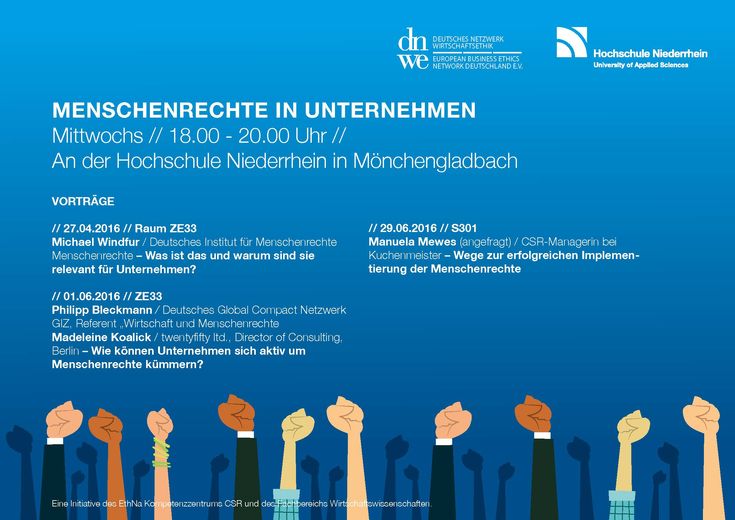 Mönchengladbach, 27. April. Das EthNa Kompetenzzentrum CSR der Hochschule Niederrhein bietet zusammen mit dem Deutschen Netzwerk Wirtschaftsethik in diesem Sommersemester eine öffentliche Vortragsreihe zum Thema Menschenrechte und Unternehmen an. Den Auftakt am heutigen Mittwoch, 27. April, macht Michael Windfur vom Deutschen Institut für Menschenrechte. Er referiert zum Thema „Menschenrechte – Was ist das und warum sind sie relevant für Unternehmen?“ Der Vortrag beginnt um 18 Uhr im Raum ZE33 am Campus Mönchengladbach (Richard-Wagner Straße 97, 41065 Mönchengladbach).