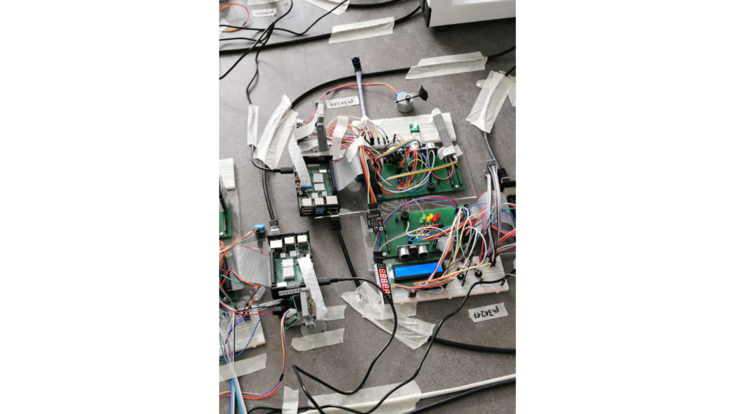 Für den Programmierteil der Gruppenaufgabe musste das Projektteam zunächst alle technischen Voraussetzungen schaffen. Dies beinhaltete die Ergänzung der bestehenden Hardware durch weitere Sensoren (z. B. zur Messung von Temperatur, Luftdruck oder Helligkeit) und Aktoren (wie LCD-Display oder LED-Matrix), um individuelle Aufgaben für eine große Studierendenanzahl realisieren zu können. Anschließend bauten wir die Hardware im Labor auf und ermöglichten den Studierenden einen Remote-Zugriff. Für den Aufbau mussten u. a. die entsprechenden Softwarevoraussetzungen geschaffen werden. Letzteres beinhaltete das Konfigurieren des Netzwerkes zum Zugriff auf die Hardware und die Verteilung der Zugangsdaten. Damit die Studierenden die Erfolge ihres Programmierens außerhalb des Labors sehen konnten (z. B. das Aufleuchten von LED-Lämpchen), brachte das Team Webcams über der Hardware an und stellte ihre Anzeigen via Stream auf einer Website zur Verfügung.