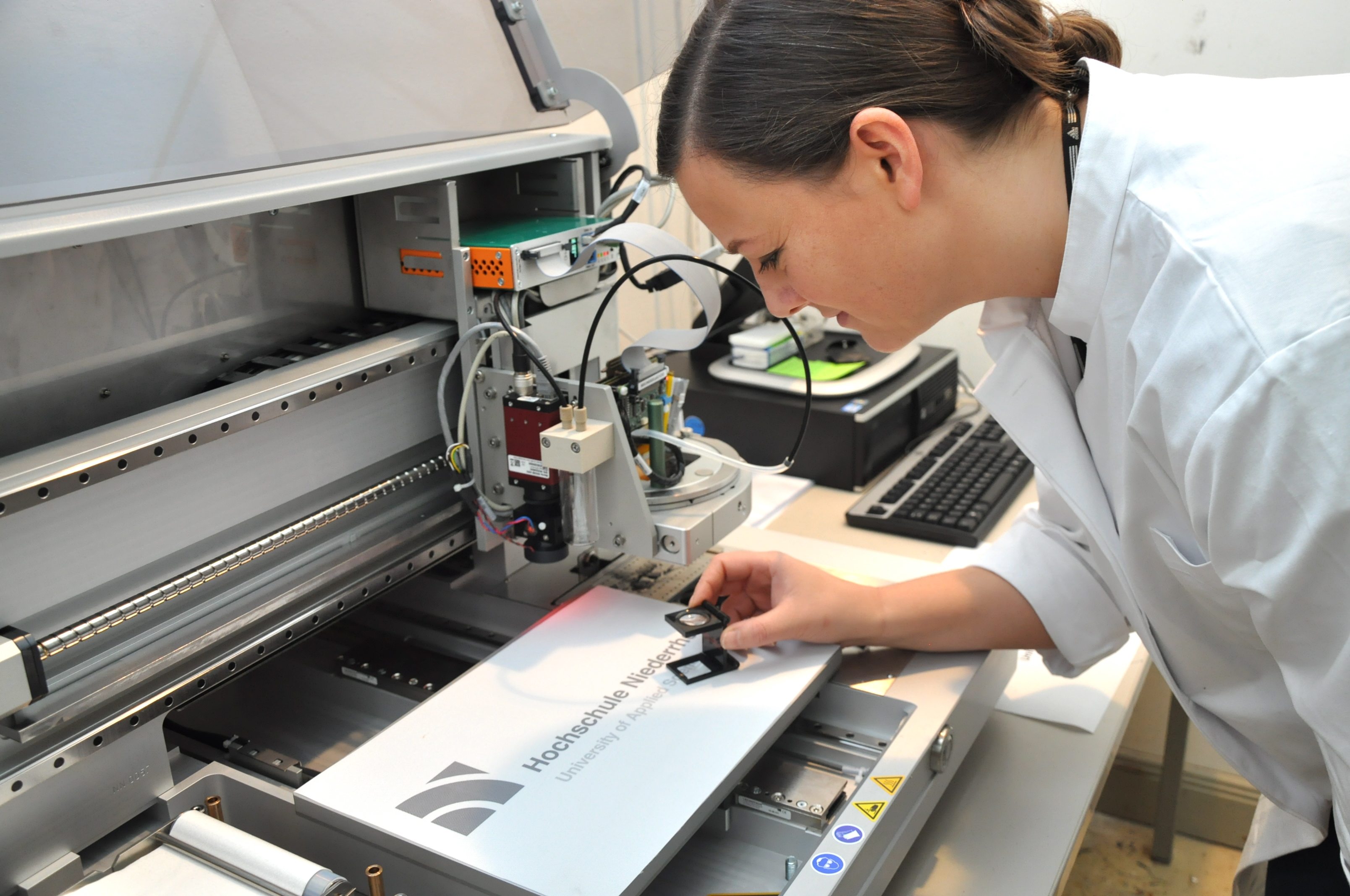 Rabe und ihre Mitarbeiter/innen testen in den nächsten Monaten das neue Verfahren auf Textilien. Seit einigen Tagen steht für die Druckexperimente ein F&E-Drucker der Firma OTB Solar Roth &Rau B.V. im Technikum an der Webschulstraße 31 in Mönchengladbach. Finanziert wurde das etwa 80.000 Euro teure Hightech-Gerät aus Projektmitteln. Die Mönchengladbacher Textilunternehmen Willy Schmitz Tuchfabrik GmbH und Junkers & Müllers GmbH werden ihre Erfahrungen im Bereich der technischen Textilien und des Textildrucks in die Untersuchungen mit einfließen lassen und die textilen Stoffe bereitstellen.