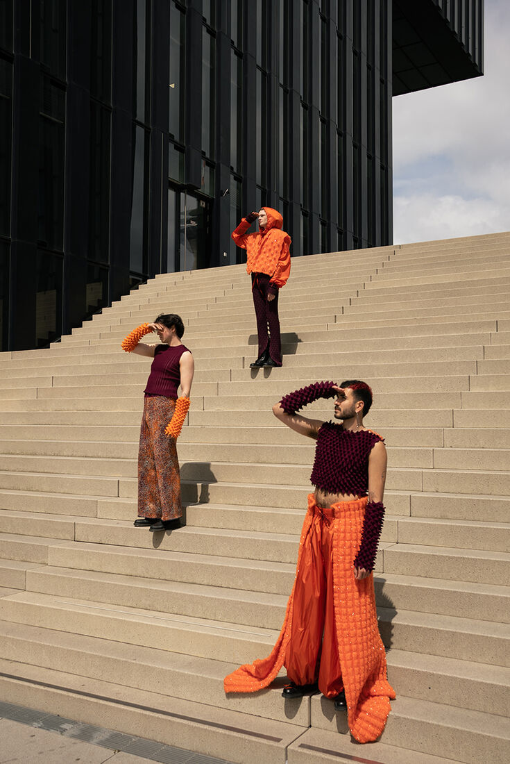 Mit PLAY PAUSE! entwickelte Jana Lewin eine monomateriale Strickkollektion als fantasievollen Gegenentwurf zu Leben und Stimmung in Krisenzeiten. Ein großer Bestandteil des Designprozesses bestand darin, die Flächen und Strukturen an Strickmaschinen in den Laboren des Fachbereichs Textil- und Bekleidungstechnik zu entwickeln.