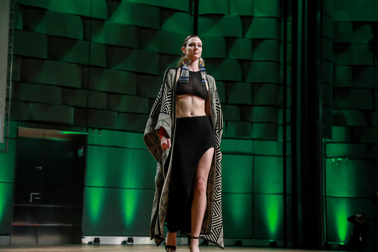 Die Studierenden interpretierten mit ihren Outfits vier aktuelle Themen: Creativity, Sustainability, Innovation und Diversity. Gabriela Paranhos Lopes ließ sich für ihre Strick-Kollektion "MOTIRÕ" von Grafiken, Körperbemalungen und Kunsthandwerk brasilianischer Urvölker inspirieren und übersetzte diese in eine zeitgemäße und nachhaltige DOB Strickkollektion. Verarbeitet wurden nur die Pflanzenfasern Bio-Baumwolle und Leinen.