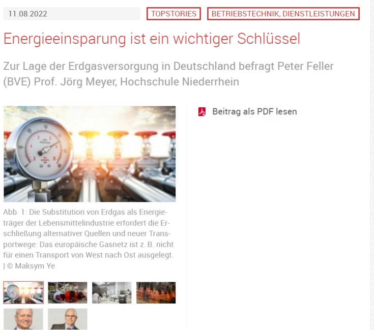 Am 23. Juni 2022 rief Bundeswirtschaftsminister Robert Habeck die Alarmstufe des Notfallplans Gas aus. Mit Blick auf eine stabile Versorgung der Menschen in Deutschland mit Lebensmitteln und Getränken müssen neben der Produktion auch der Bedarf im Verpackungs- und Logistiksektor berücksichtigt werden. Was sind die Konsequenzen aus der unsicheren Gasversorgung für die Lebensmittelindustrie und welche Handlungsoptionen verringern ihre Abhängigkeiten? Dies erfragte Peter Feller, stellvertretender Hauptgeschäftsführer der Bundesvereinigung der Deutschen Ernährungsindustrie, in einem Interview mit Prof. Dr.-Ing. Jörg Meyer, Leiter des SWK E²-Instituts für Energietechnik & Energiemanagement der Hochschule Niederrhein.