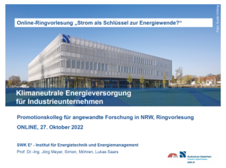 Vor diesem Hintergrund wurden im ersten Beitrag der Veranstaltung von Prof. Jörg Meyer, Hochschule Niederrhein, an einem Beispiel gezeigt, wie in einem Industriebetrieb eine Umstellung der Energieversorgung auf 100%-klimaneutralem Strom möglich ist. Im zweiten Impulsvortrag hat Dr. Stefan Nykamp, Westnetz GmbH, hinterfragt, ob die Elektrifizierung tatsächlich der Schlüssel der Energiewende ist. Oder sind Erdgas bzw. später auch grüne Gase der Schlüssel?