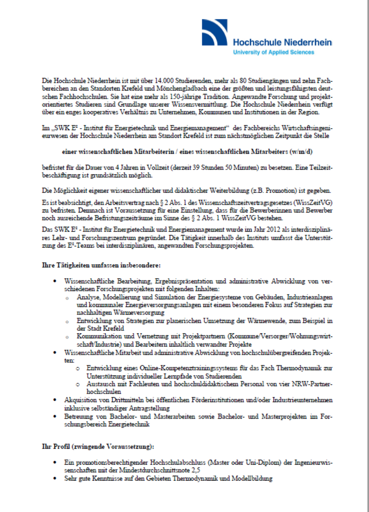 Im „SWK E² - Institut für Energietechnik und Energiemanagement“ des Fachbereichs Wirtschaftsingenieurwesen der Hochschule Niederrhein am Standort Krefeld ist zum nächstmöglichen Zeitpunkt die Stelle