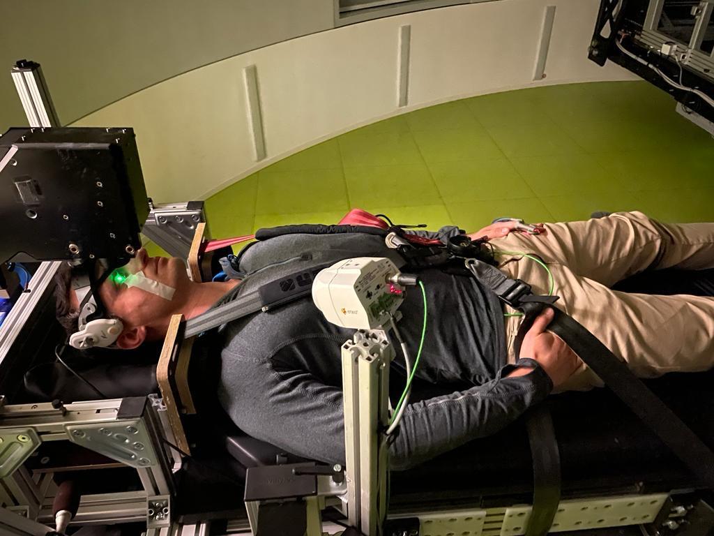 Dr. Lukas Streese ist Teil einer Forschungsgruppe am Universitätsklinikum Düsseldorf, die das Ziel verfolgt die Auswirkungen von Gravitationsveränderungen auf die Mikrozirkulation zu untersuchen. Bei längeren Weltraumaufenthalten besteht das Problem, dass Astronautinnen und Astronauten Seheinschränkungen entwickeln. Die Ursache für das sogenannte „spaceflight-associated neuro-ocular syndrome” (SANS) ist bisher nicht bekannt. Unter der Leitung von Prof. Christian Jung von der Kardiologie des Universitätsklinikums in Düsseldorf wird im Rahmen des „Retinal circulation during gravitation changes in a human centrifuge“ (RIDGE) Projektes versucht den Ursachen der mikrovaskulären Veränderungen im Auge auf den Grund zu gehen. Bei diesem Projekt sollen zusätzlich mögliche Therapieformen getestet werden, die die negativen Auswirkungen von Weltraumaufenthalten auf die Sehfähigkeit reduzieren können. Dr. Lukas Streese ist Teil des Forscherteams, dass in diesem Rahmen eine Fördersumme von 600.000 € einwerben konnte. Herr Streese wird bei diesem Projekt seine Expertise aus der retinalen Gefäßdiagnostik einbringen. Die ersten Probemessungen hat Herr Streese mit dem Forscherteam bereits durchgeführt (siehe Bilder). Ziel ist es, die retinale Mikrozirkulation bei unterschiedlichen g-Kräften während des Drehens der Zentrifuge zu messen. Dabei sollen unterschiedliche Körperlagen miteinander verglichen werden. Das RIDGE Projekt ist ein tolles Beispiel wie das Projekt Tandem Niederrhein interdisziplinäre Zusammenarbeit ermöglicht.