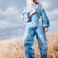 The core of the idea: to realize the used look through digital printing instead of chemical or mechanical treatment. The idea is not only to rethink on a technological level, but also on a design level. Thus, the aim is not to produce a perfect imitation of conventional denim, but rather to discuss the visual details that shape and make up the jeans character and to interpret and use them in a new way. Thematically, the collection explores the Norwegian philosophy of Friluftsliv, a model of a nature-based way of life, and is embodied in five outfits, each themed around an ecosystem. Silhouettes with workwear character as well as multifunctional details characterize the cut design. The prints are dedicated to the textures and structures that can be found in the respective ecosystems.