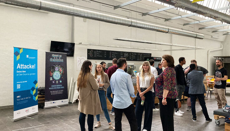 Es trafen sich wieder mehr als 20 Gründer:innen in der Shedhalle des Fachbereichs Design am Campus West der HSNR und sprachen über ihre Erfahrungen, Visionen, Wünsche und Vorhaben. Sowohl in Gruppen - als auch in Einzelgesprächen - gab es einen regen Austausch zwischen Gründer:innen und den HNX Teammitgliedern. Zur entspannten Atmosphäre gab es kühle Getränke und Fingerfood, was das aktive Networking geschmackvoll untermalte.