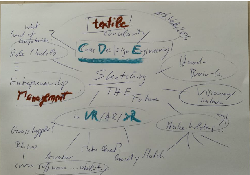 The focus lies on experimental, co-creative work in virtual spaces. So that ideas are not only discussed, but directly sketched, modeled, tested and iterated in VR — combining digital design tools with analog sketching and concepting approaches – constructing textile design solutions virtually is the focus on.