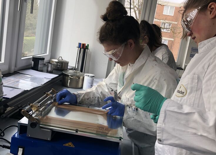 Nach sehr unterschiedlichen aufeinander aufbaueneden Studieninhalten, schloss das dazugehörige Wahlpflichtfach "Materialien und Verfahren" mit einer Exkurison nach Leverkusen zum Unternehmen Covestro ab. Dort konnten die Studierenden in Laborführungen, Informationsveranstaltungen sowie einer Diskussionsrunde Einblicke in die Entwicklungsabteilung im Bereich Smart Textiles gewinnen.
