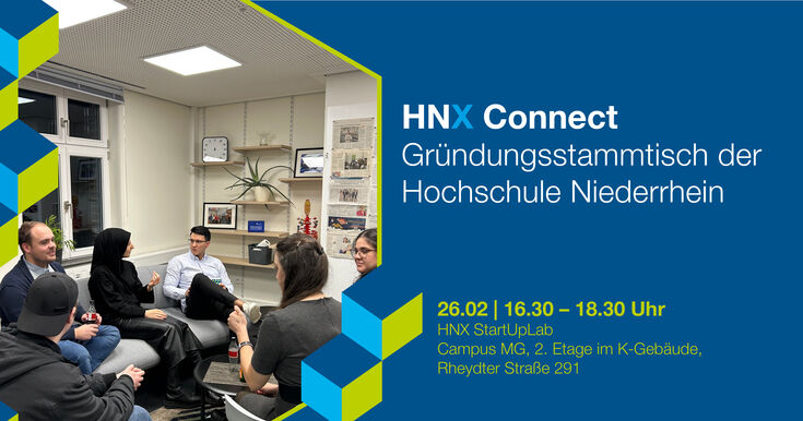 Im Februar treffen wir uns wieder im HNX StartUpLab am Campus Mönchengladbach zum lockeren Austausch rund ums Gründen. Egal ob du schon gründest oder einfach erstmal reinschnuppern möchtest, komm vorbei, vernetze dich und bring deine Ideen mit. Snacks und Getränke gibt’s natürlich auch.