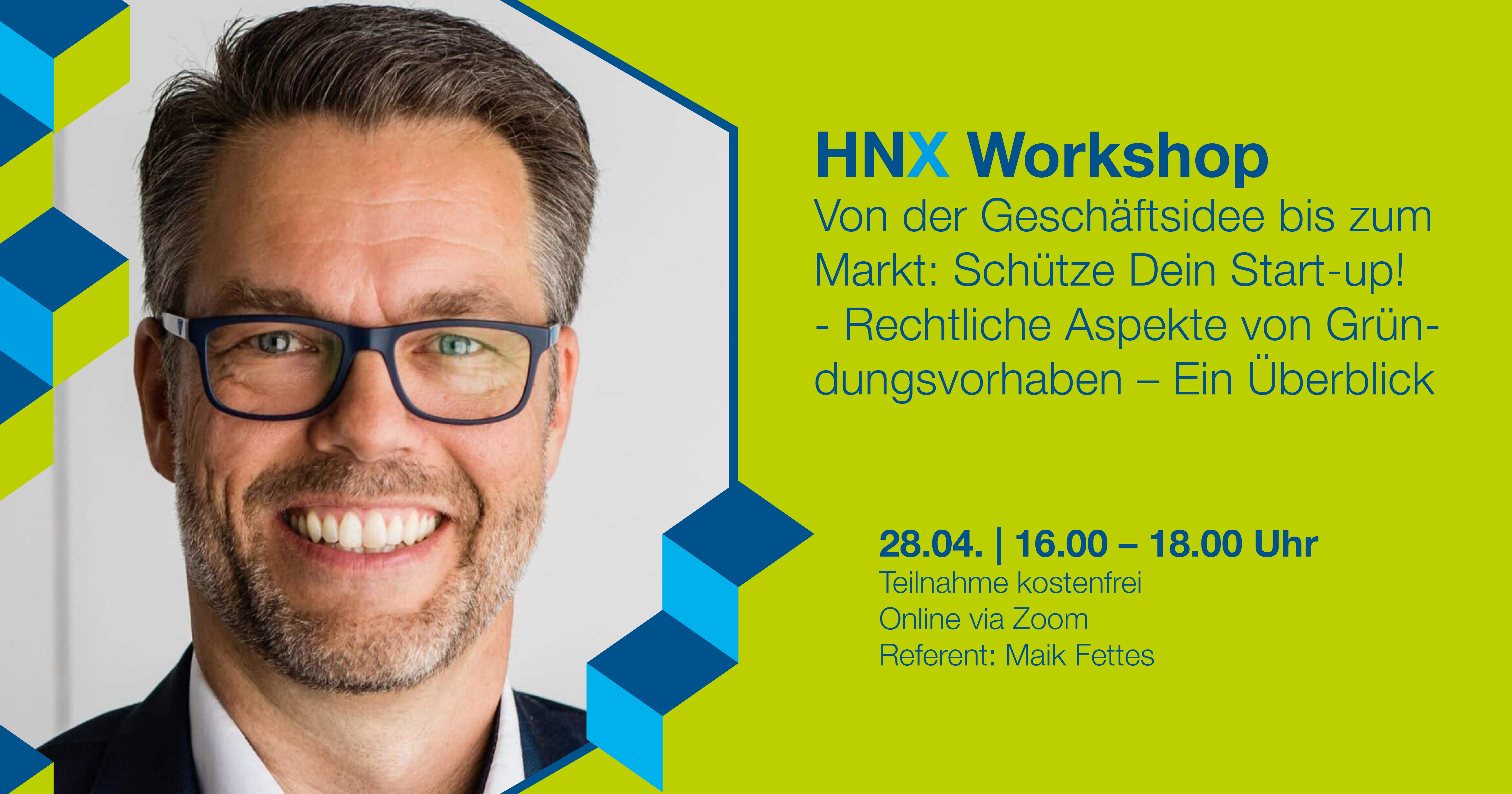 Im diesem HNX-Workshop dreht sich alles um die rechtlichen Grundlagen rund um Gründung und Geschäftsideen. Referent Maik Fettes gibt praxisnahe Einblicke in zentrale Themen wie Vertragsrecht (Dienstleistungs- und Werkverträge), Datenschutz und Impressum, Ideenschutz sowie die Recherche in relevanten Datenbanken.