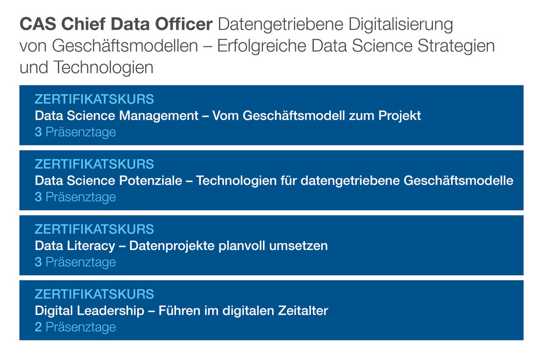 Das ONLINE-Zertifikatsstudium (CAS) „Chief Data Officer“ vermittelt Ihnen die Grundlagen und Kompetenzen, um die Digitalisierung von Geschäftsmodellen erfolgreich zu konzipieren, umzusetzen und zu führen. Sie lernen, Data Science Technologien unter Verwendung modernster Methoden, Prozesse und Werkzeuge zielgerichtet einzusetzen.