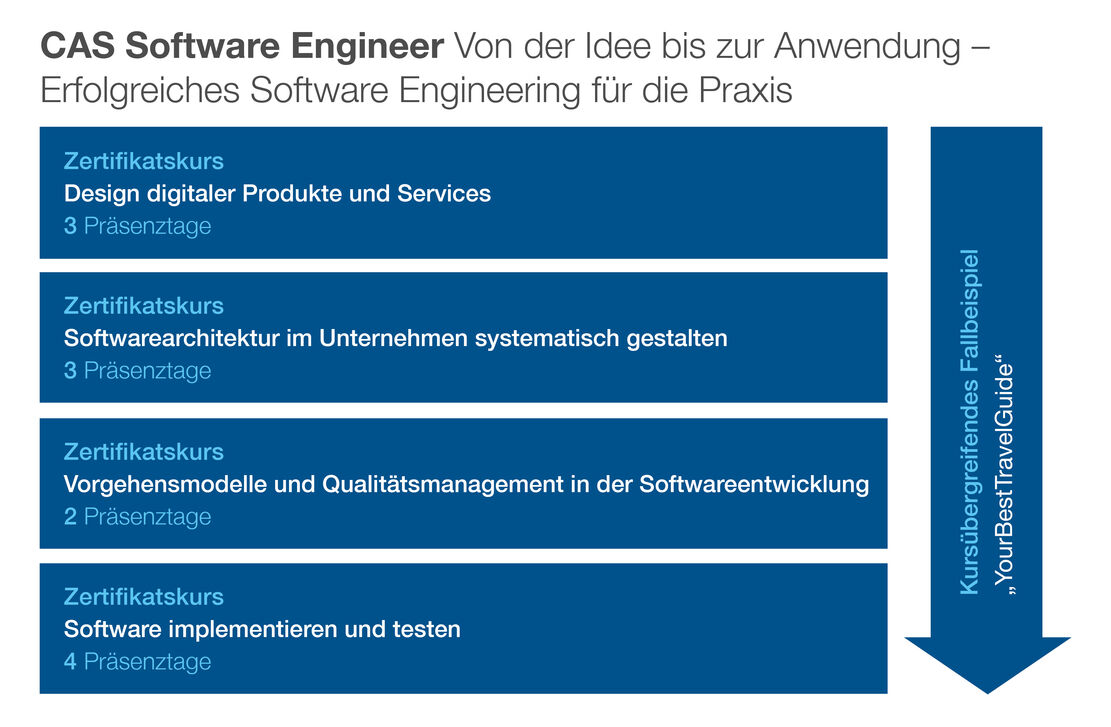 Immer neue Tools, Frameworks, etc. versprechen, dies zu ermöglichen. Das effiziente Entwickeln einer bedürfnisorientierten, zuverlässigen und langlebigen Software erfordert jedoch vor allem anderen eine konsequent methodische Vorgehensweise über den gesamten Entwicklungsprozess, angepasst auf die jeweilige Situation. Darum geht es in diesem Zertifikatstudium.