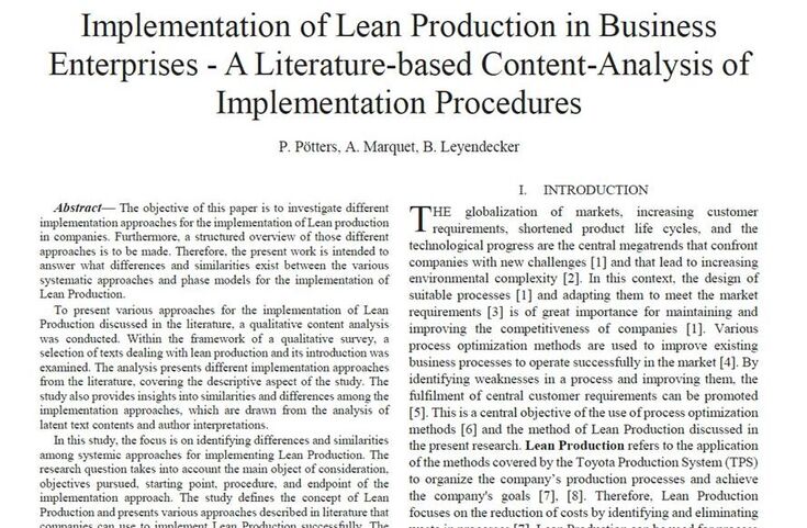 Pötters, P.; Marquet, A.; Leyendecker, B. (2023): Implementation of Lean Production in Business Enterprises: A Literature-Based Content Analysis of Implementation Procedures. In: World Academy of Science, Engineering and Technology. International Journal of Industrial and Manufacturing Engineering. Barcelona 22.-23.05.2023. Vol:17, No:05, 2023.