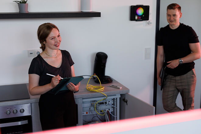 Mit dem IoT-Labor haben wir ein realistisches Szenario entwickelt, in dem unsere Studierenden Daten und Analytik in einem ansprechenden Ambiente erleben und „anfassen“ können. Dazu haben wir zwei Räumlichkeiten geschaffen – eine Küche und ein Wohnzimmer – die mit Technologie aus den Bereichen Smart Home und Smart Metering in Form von verschiedenen Sensoren, Aktoren und vielen smarten Geräten ausgestattet, die miteinander vernetzt sind und Daten erfassen.